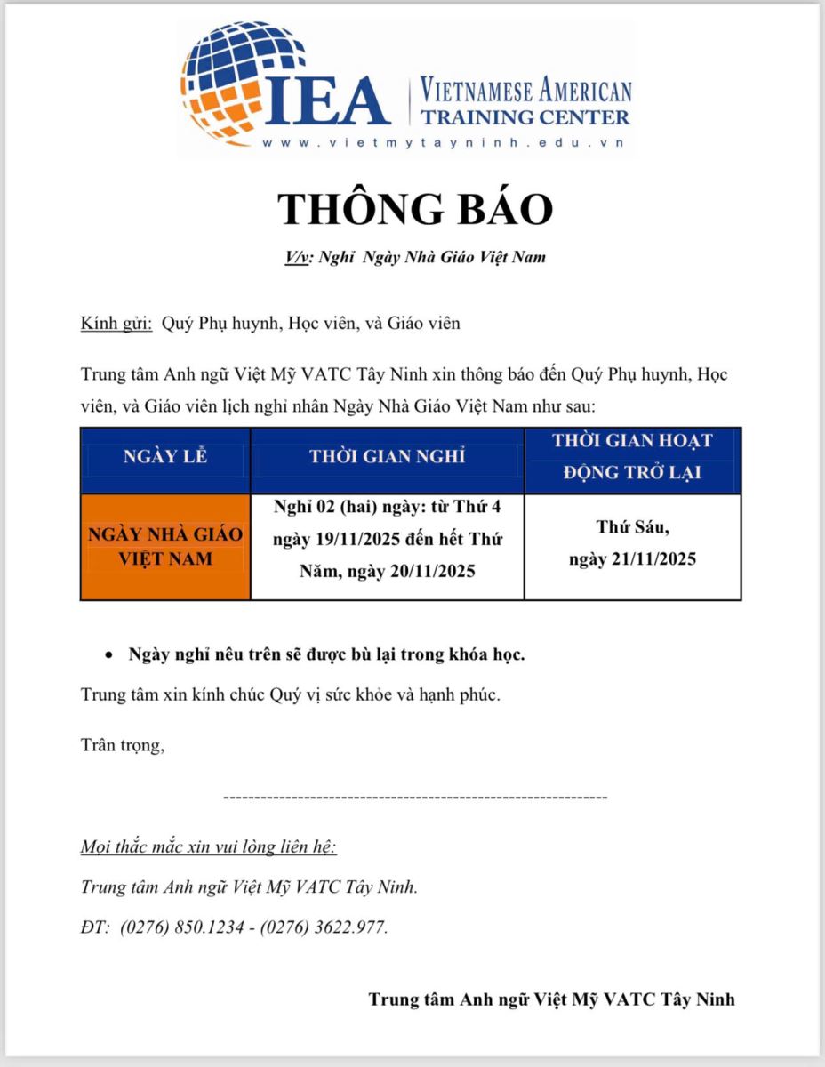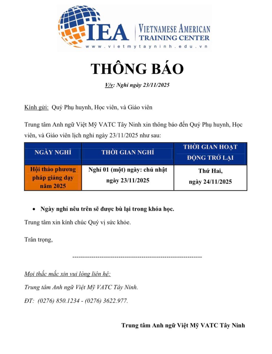 Nghỉ 3 ngày: 19-20/11/25 và 23/11/25